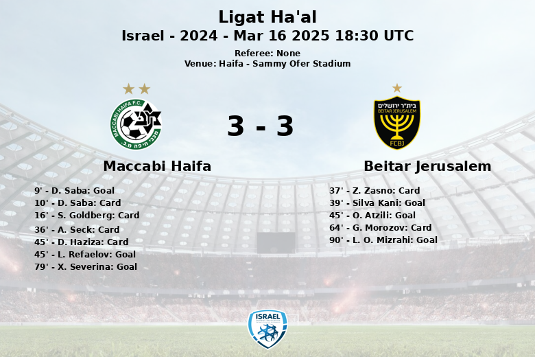 X. Severina put Maccabi Haifa ahead in the 79th minute, but L. O. Mizrahi scored in the 90th minute to secure a 3-3 draw for Beitar Jerusalem. Maccabi Haifa had 13 shots (7 on target), while Beitar Jerusalem managed 20 (4 on target). Beitar Jerusalem also enjoyed a corner-kick advantage (4-1). A vibrant and exciting match that ended in a well-deserved draw for both teams.