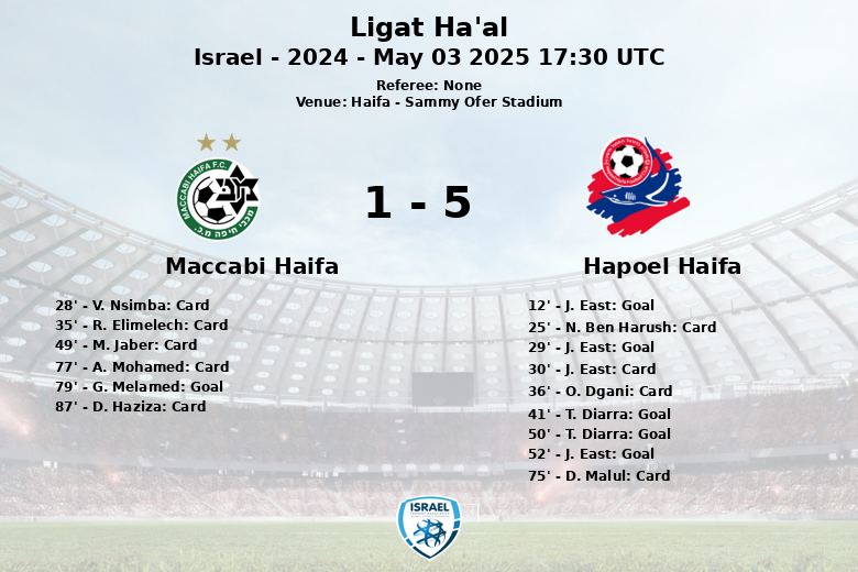 Jhon East shone, scoring a hat-trick (12′, 29′, 52′), while T. Diarra netted two goals (41′, 50′). G. Melamed scored Maccabi Haifa’s lone goal in the 79th minute. The match saw a flurry of attacks, resulting in 19 total shots. Despite Maccabi Haifa’s superior possession (62%), Hapoel Haifa proved more clinical, converting five of their nine shots on target. The game also witnessed a high number of yellow cards, with five for Maccabi Haifa and four for Hapoel Haifa.