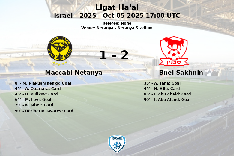 Maccabi Netanya took the lead in the 8th minute with a goal by M. Plakushchenko, after a missed penalty where he himself capitalized on the rebound. Bnei Sakhnin responded in the 35th minute thanks to a goal by A. Taha, leveling the score with an assist by J. Bushnaq.