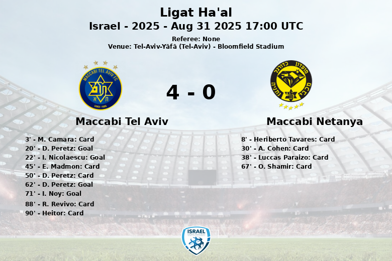 In the second half, D. Peretz scored again in the 62nd minute, this time assisted by I. Shahar, consolidating Maccabi Tel Aviv’s lead. Finally, I. Noy sealed the victory with a goal in the 71st minute, assisted by S. Jehezkel.