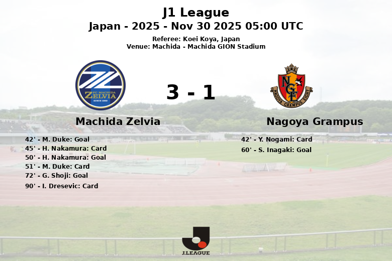 At the start of the second half, H. Nakamura extended Machida Zelvia’s lead in the 50th minute, assisted by M. Duke. Shortly after, M. Duke received a yellow card. Nagoya Grampus pulled one back in the 60th minute through a penalty converted by S. Inagaki. However, Machida Zelvia sealed the victory in the 72nd minute with a goal by G. Shoji, assisted by K. Sento.