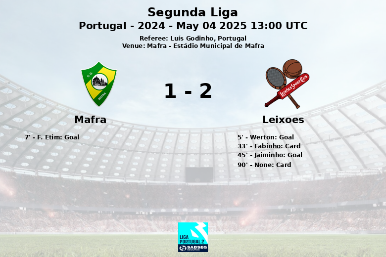 Leixões and Mafra played a thrilling match at the Estádio Municipal de Mafra, corresponding to matchday 32 of the Portuguese Segunda Liga. The game, played on May 4th, 2025, featured an exchange of goals that kept the excitement high until the final whistle. Werton opened the scoring for Leixões in the 5th minute, assisted by Bica. However, Mafra responded quickly with a goal from F. Etim in the 7th minute, assisted by R. Matos. Before halftime, Leixões regained the lead with a goal from Jaiminho in the 45th minute, assisted by Werton. The 2-1 scoreline in favor of Leixões remained until the end, despite chances for both teams. Fabinho received a yellow card for Leixões in the 33rd minute, and another Leixões player received a yellow card in the 90th minute. The match, refereed by Luís Godinho, concluded with a narrow victory for Leixões.