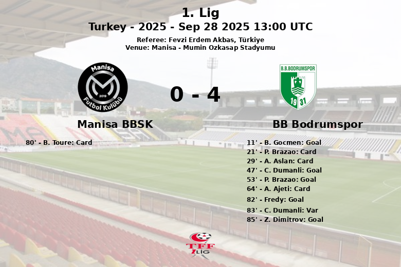 In the second half, BB Bodrumspor extended their lead with goals from C. Dumanli in the 47th minute and P. Brazao in the 53rd minute, both assisted by T. Seferi. However, the match was not without controversy, as Fredy missed a penalty in the 82nd minute. Subsequently, a goal by C. Dumanli was disallowed by VAR in the 83rd minute. Finally, Z. Dimitrov sealed the victory with a goal in the 85th minute, assisted by Fredy. The match concluded with a win for BB Bodrumspor, who despite having less possession (47%) achieved greater effectiveness in front of the opponent’s goal with 7 shots on target compared to Manisa BBSK’s 4.