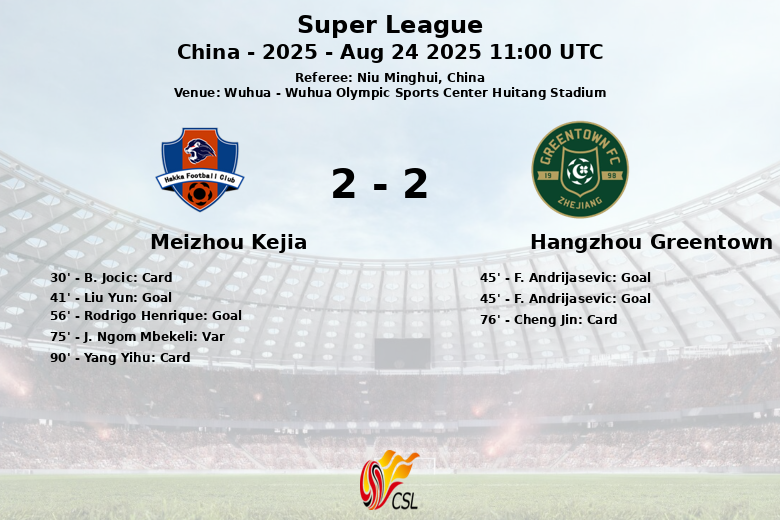 Wuhua, China – In a hard-fought match at the Wuhua Olympic Sports Center Huitang Stadium, Meizhou Kejia and Hangzhou Greentown drew in an action-packed game corresponding to Matchday 22 of the Super League. Under the refereeing of Niu Minghui, the match, played on August 24, 2025, offered moments of tension and excitement.