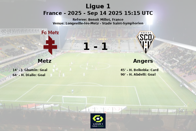 Metz had the opportunity to extend their lead in the 64th minute, but H. Diallo missed a penalty. In the 90th minute, Angers managed to equalize through a penalty converted by H. Abdelli, closing the match with a draw.