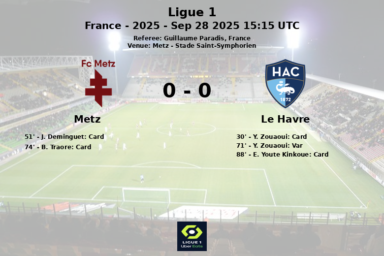 Metz and Le Havre played out a hard-fought goalless draw in matchday 6 of Ligue 1, held at the Stade Saint-Symphorien in Metz. The match, officiated by Guillaume Paradis, was characterized by intense midfield battles and imprecise attacking play.