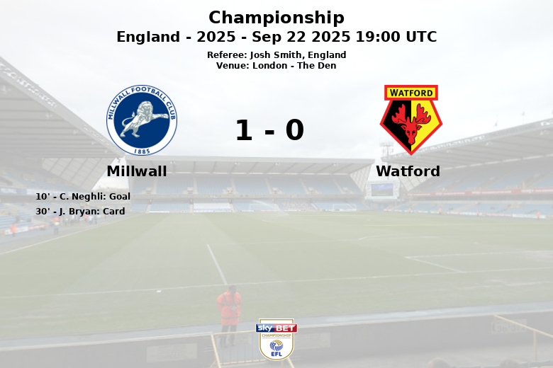 London, England – In a match held at The Den, Millwall achieved a valuable victory over Watford on the sixth matchday of the Championship. The only goal of the match came early, in the 10th minute, thanks to C. Neghli, who capitalized on an assist to beat the Watford goalkeeper.