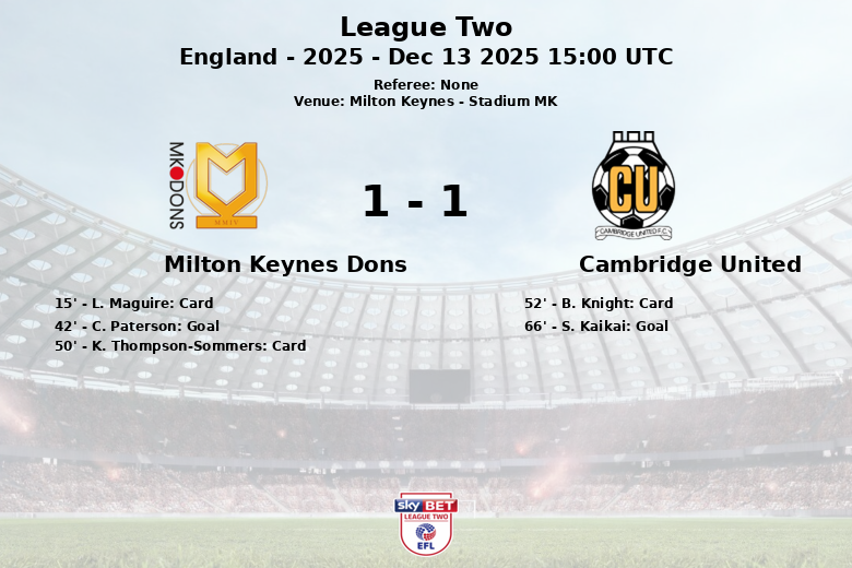 Milton Keynes Dons took the lead just before halftime, thanks to a goal by C. Paterson in the 42nd minute, assisted by L. Kelly. However, Cambridge United responded in the second half and S. Kaikai leveled the score in the 66th minute, assisted by J. Gibbons.