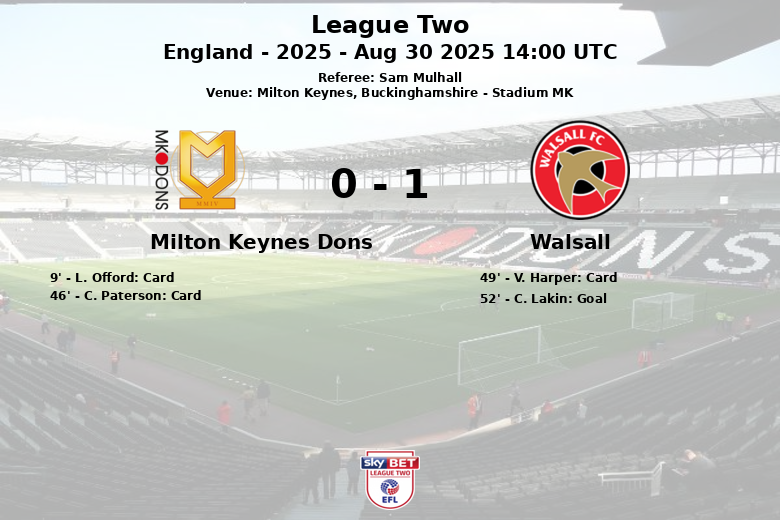 Milton Keynes, Buckinghamshire – In a match played at Stadium MK, Walsall secured a valuable victory against Milton Keynes Dons, despite being dominated in possession and overall statistics. The game, corresponding to the sixth matchday of League Two, saw a pragmatic Walsall capitalize on their opportunities to take all three points.