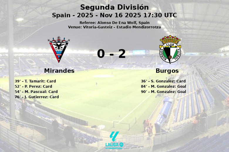 Vitoria-Gasteiz, Spain – In a match held at the Estadio Mendizorrotza, Burgos secured a victory against Mirandés with a final score of 2 to 0. The game, corresponding to matchday 14 of the Segunda División, was marked by intensity and numerous cautions, with five yellow cards shown to Mirandés and one to Burgos.