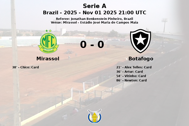 Mirassol, November 1st, 2025 – In a match played at the Estádio José Maria de Campos Maia, Mirassol and Botafogo drew goalless in a game where possession was clearly dominated by the home team. Mirassol controlled 66% of the ball, generating 9 shots, although only one of them managed to be on target. In addition, they earned 7 corner kicks.