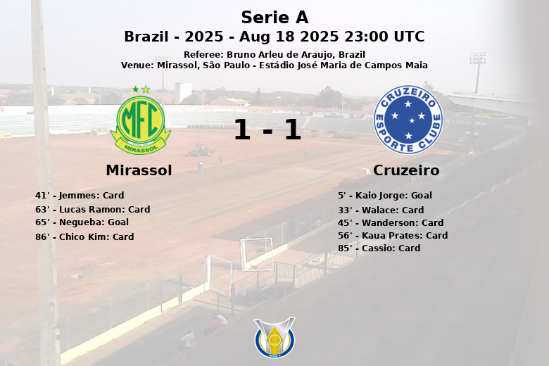 Cruzeiro took an early lead in the 5th minute thanks to a goal by Kaio Jorge, assisted by Matheus Pereira. However, the lead would not last. The match became increasingly physical, reflected in the cautions given to Walace, Wanderson, Kaua Prates, and Cassio for Cruzeiro, as well as Jemmes, Lucas Ramon, and Chico Kim for Mirassol.