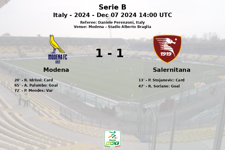 Salernitana and Modena played out a 1-1 draw in a thrilling encounter at the Stadio Alberto Braglia in Modena. The match, corresponding to round 16 of the Italian Serie B, was characterized by an intense game with few clear goal-scoring opportunities. The first half was marked by tension, with yellow cards for Stojanovic (Salernitana) and Idrissi (Modena) in the 13th and 20th minutes respectively. Soriano put Salernitana ahead in the 47th minute, but Palumbo equalized for Modena in the 65th, assisted by Defrel. Modena had more possession (57%) and more shots (13 to 11), but Salernitana proved effective on the counter-attack. A goal disallowed for offside for Modena in the 72nd minute added excitement to the match. In the end, the 1-1 score reflected a balanced game.