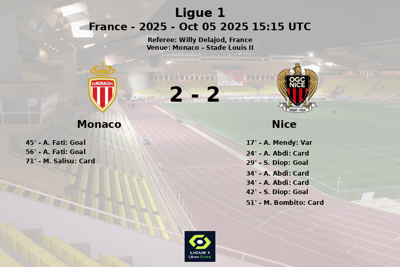 Despite having the numerical advantage and dominating the statistics with 20 total shots (6 on target) and 6 corners, Monaco could not break down the Nice defense and secure the victory. The match was marked by cards: Monaco received one yellow card, while Nice accumulated three yellow cards and Abdi’s red card. A disallowed goal for Nice by VAR in the 17th minute also added controversy to the encounter. Willy Delajod’s officiating was tested in a match full of incidents.
