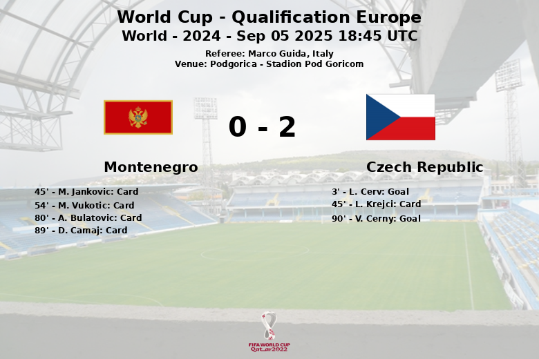 The Czech Republic secured a valuable victory on their visit to Montenegro in a match corresponding to the World Cup qualifying stage. The match, played at the Stadion Pod Goricom in Podgorica, ended with a score of 2 to 0 in favor of the visiting team.