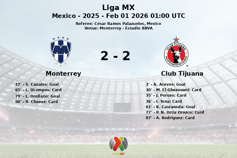 Monterrey, Mexico – The Estadio BBVA witnessed a vibrant Liga MX match between Monterrey and Club Tijuana, corresponding to Round 4 of the Clausura 2025. Monterrey emerged victorious in a hard-fought and eventful game, with a final score of Monterrey 2 – Club Tijuana 2.