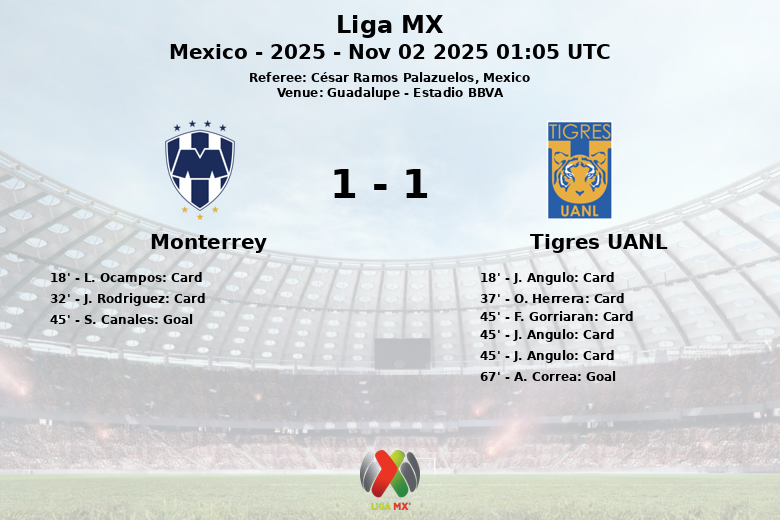 Guadalupe, Mexico – A tense Monterrey derby between Monterrey and Tigres UANL ended in a 1-1 draw at the Estadio BBVA, a match marked by intensity and controversy. The match, valid for matchday 16 of the Liga MX Apertura 2025, was full of emotions from the start.
