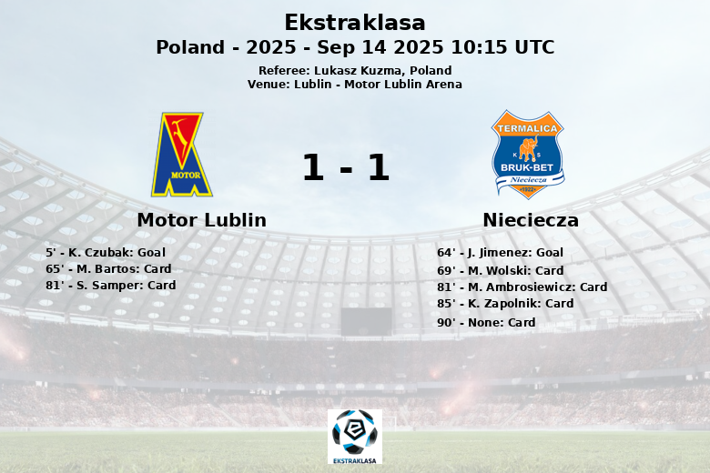 Lublin, Poland – A hard-fought match at the Motor Lublin Arena ended in a 1-1 draw between Motor Lublin and Nieciecza, in a game belonging to matchday 8 of the Ekstraklasa. Motor Lublin took an early lead in the 5th minute thanks to a goal by K. Czubak, assisted by B. van Hoeven. The initial goal gave the home side an early advantage and control of the match.
