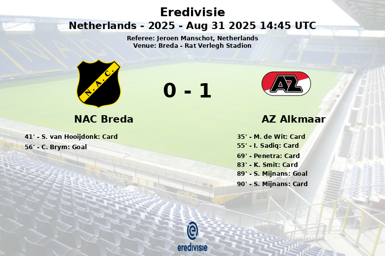 The match was tense from the start. M. de Wit of AZ received the first yellow card in the 35th minute. In the second half, I. Sadiq was also cautioned in the 55th minute. NAC Breda had the opportunity to take the lead in the 56th minute, but C. Brym missed a penalty. Later, Penetra and K. Smit of AZ received yellow cards in the 69th and 83rd minutes, respectively.