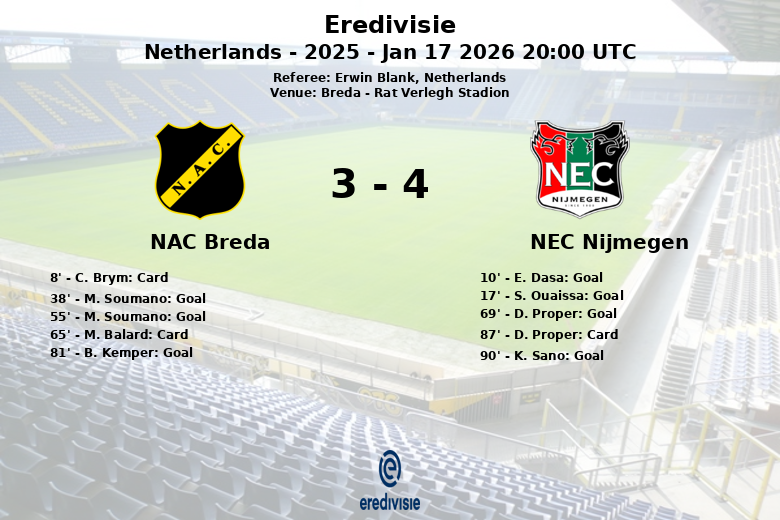 The second half began with a more aggressive NAC Breda. Soumano scored again in the 55th minute, leveling the score. But D. Proper of NEC Nijmegen put his team ahead again in the 69th minute, assisted by T. Chery. NAC Breda’s response was immediate, with B. Kemper scoring in the 81st minute, thanks to an assist from L. Holtby. The game seemed headed for victory for NEC Nijmegen when K. Sano scored in the 90th minute, assisted by T. Chery.