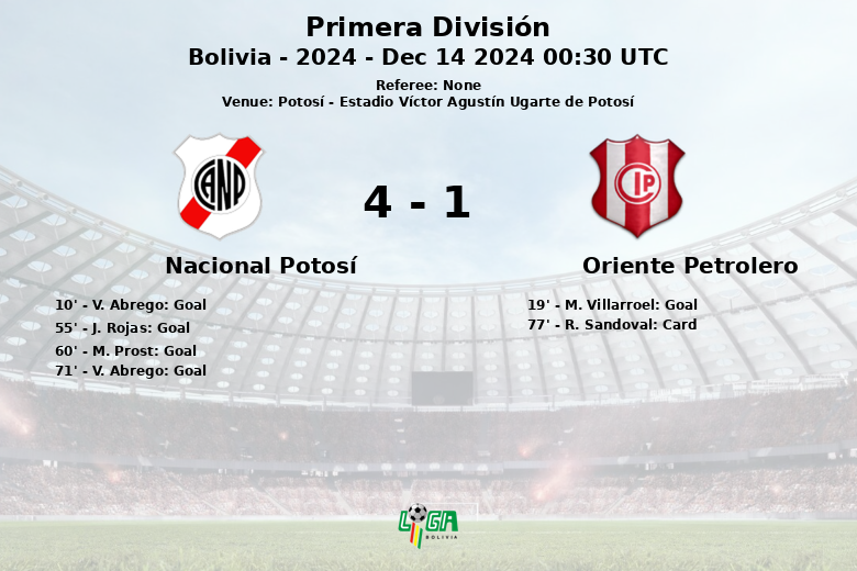Nacional Potosí thrashed Oriente Petrolero in a thrilling match played at the Estadio Víctor Agustín Ugarte de Potosí, corresponding to matchday 28 of the 2024 Clausura of the Bolivian Primera División. The game, played on December 14th at 00:30, was a clear display of home dominance, reflected in the ball possession (65% for Nacional Potosí vs 35% for Oriente Petrolero). Nacional Potosí opened the scoring in the 10th minute with a goal from V. Abrego, assisted by S. Guerra. Oriente Petrolero equalized in the 19th minute thanks to M. Villarroel, assisted by H. Dorrego. However, Nacional Potosí’s superiority became evident in the second half. Rojas scored the 2-1 in the 55th minute, Prost increased the lead to 3-1 in the 60th minute, and Abrego sealed the victory with his second goal of the match in the 71st minute. The final result was a resounding 4-1 victory for Nacional Potosí, who demonstrated their superiority with 29 shots (14 on target) against Oriente Petrolero’s 8 (5 on target). Despite their dominance, Nacional Potosí only conceded 11 fouls, while Oriente Petrolero conceded 10 and received one yellow card. Nacional Potosí also earned 9 corners compared to Oriente Petrolero’s 4.