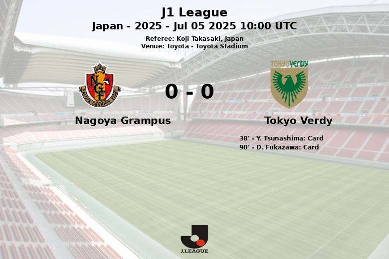 The discipline in the game was reflected in the number of fouls, with Tokyo Verdy committing 16 infractions, resulting in two yellow cards, one for Y. Tsunashima in the 38th minute and another for D. Fukazawa in the 90th minute. On the other hand, Nagoya Grampus, although with less possession, generated 6 shots, with only one forcing the goalkeeper to intervene. Referee Koji Takasaki issued zero yellow cards to Nagoya Grampus. The match unfolded without major incidents and with possession alternating between both teams. The number of corners was equal for both teams with 4 corners.