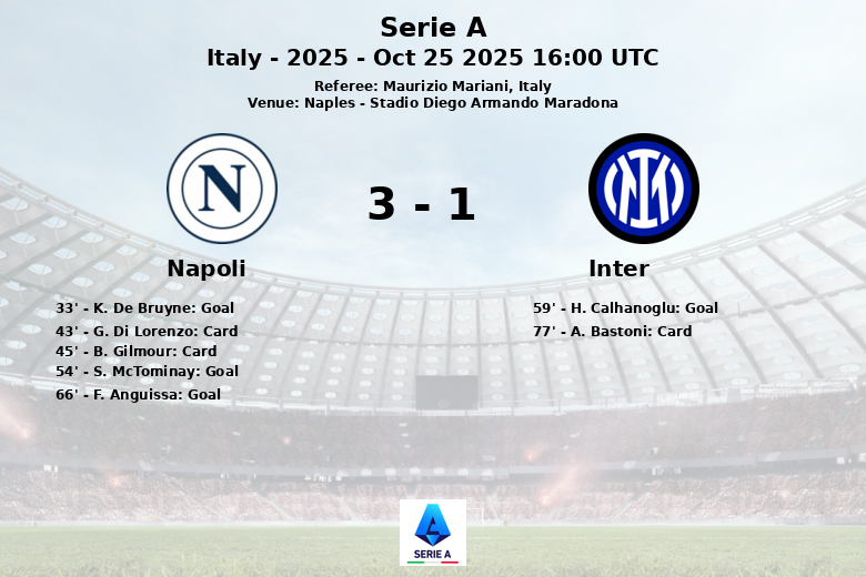 Napoli, with 43% possession, proved effective in front of goal, especially in the first half. K. De Bruyne opened the scoring from the penalty spot in the 33rd minute. In the second half, S. McTominay extended the lead in the 54th minute with a goal assisted by L. Spinazzola. Inter reacted with a penalty converted by H. Calhanoglu in the 59th minute, reducing the deficit. However, F. Anguissa sealed the match in the 66th minute with a goal, assisted by David Neres.