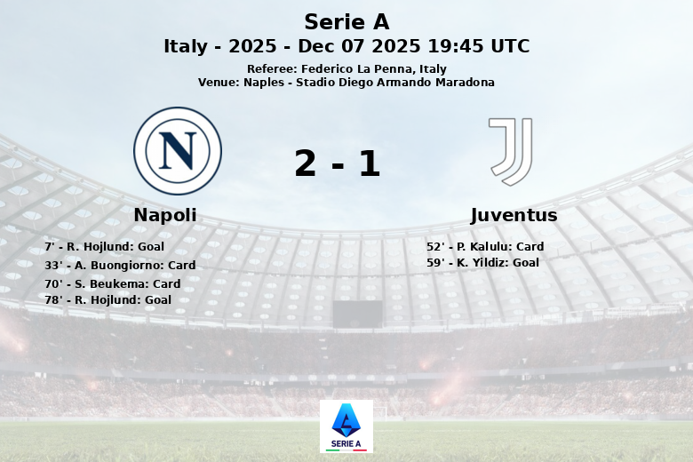 Napoli took the lead early, in the 7th minute, with a goal by R. Hojlund assisted by David Neres. However, Juventus responded in the second half. K. Yildiz equalized in the 59th minute, with an assist from W. McKennie.