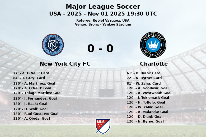 The match, corresponding to the Round of 16 of Major League Soccer, was marked by intensity, reflected in the numerous fouls committed by both teams (16 by New York City FC and 13 by Charlotte) and the five yellow cards shown by referee Rubiel Vazquez (two for the home team and three for the visitors).