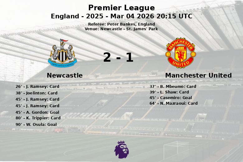 The first half was a whirlwind of emotions. Newcastle suffered the expulsion of J. Ramsey just before halftime, after receiving his second yellow card. Despite playing with ten men, A. Gordon put the home team ahead thanks to a penalty. The joy was short-lived, as Casemiro equalized before the break, assisted by B. Fernandes.