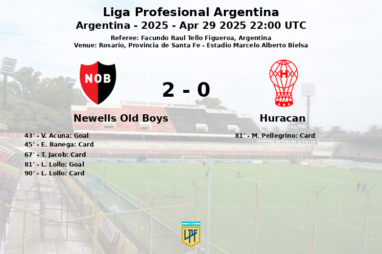Rosario, April 29, 2025 – Newell’s Old Boys secured a victory against Huracán in a match played at the Estadio Marcelo Alberto Bielsa, corresponding to matchday 15 of the Argentine Professional League. The match, refereed by Facundo Raul Tello Figueroa, ended with a 2-0 scoreline in favor of the home side.