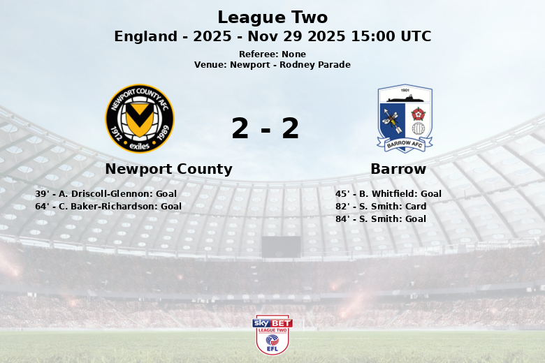 In the second half, C. Baker-Richardson restored Newport County’s lead in the 64th minute, following an assist from S. Braybrooke. But Barrow did not give up and, after much persistence, managed to equalize the match in the 84th minute thanks to a goal by S. Smith, with an assist from C. Mahoney.