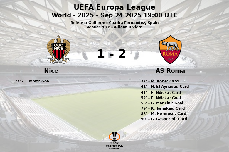Nice, France – AS Roma secured a victory at the Allianz Riviera in a UEFA Europa League match that ended with a score of 2-1 in favor of the Italian team. The match, played on September 24, 2025, was characterized by intense play and a high number of fouls.