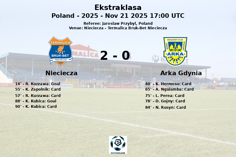 Nieciecza, Poland – In a hard-fought match at the Termalica Bruk-Bet Nieciecza stadium, the home team secured a victory against a resilient Arka Gdynia. The match, part of the 16th round of the Polish Ekstraklasa, was marked by intensity and numerous interruptions.