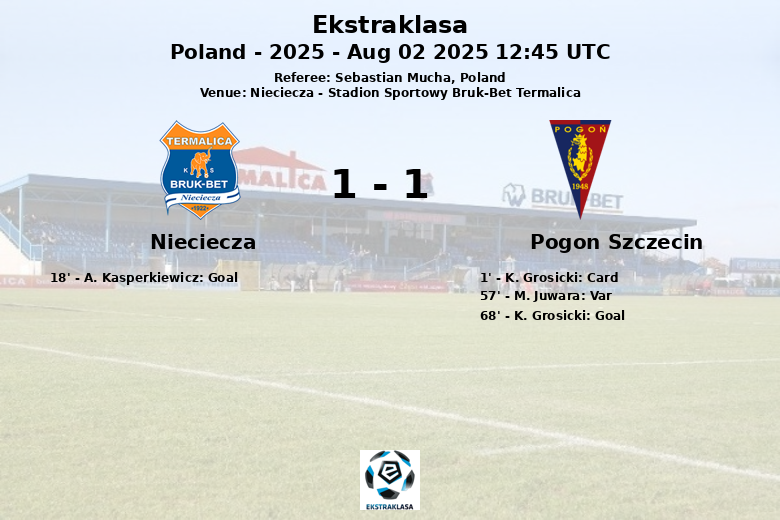The match started with a yellow card for K. Grosicki of Pogon Szczecin in the first minute. Nieciecza took the lead in the 18th minute thanks to a goal by A. Kasperkiewicz, assisted by M. Ambrosiewicz. Pogon Szczecin dominated possession with 58%, but struggled to convert it into clear scoring opportunities. A goal by M. Juwara for Pogon Szczecin was disallowed by VAR in the 57th minute due to a handball. Finally, K. Grosicki managed to equalize in the 68th minute, assisted by F. Ulvestad.