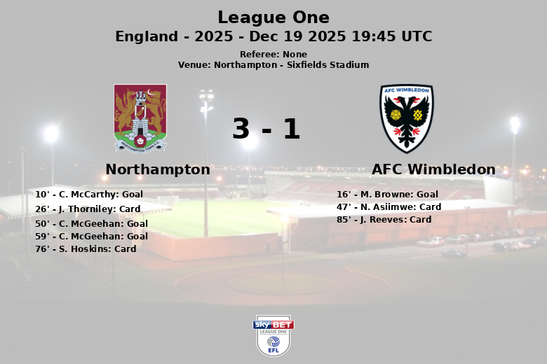 In the second half, Northampton regained the lead with a goal from C. McGeehan in the 50th minute, assisted by E. Wheatley. McGeehan struck again, extending the home side’s advantage in the 59th minute, this time with an assist from C. McCarthy. Despite the efforts of AFC Wimbledon, including a yellow card for N. Asiimwe, Northampton managed to maintain their lead. The match concluded with another yellow card for S. Hoskins of Northampton and J. Reeves of AFC Wimbledon.