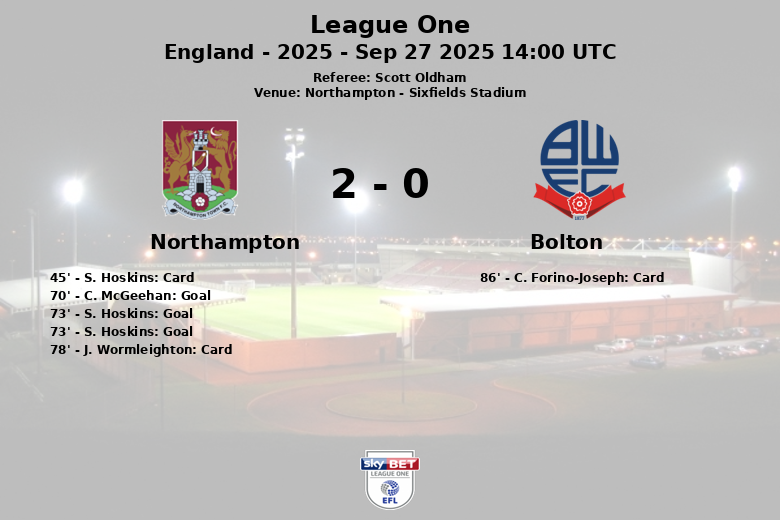 The game remained balanced until the 70th minute, when C. McGeehan scored the first goal for Northampton. Shortly after, in the 73rd minute, S. Hoskins missed a penalty, but instantly redeemed himself by scoring a goal from open play immediately afterwards. Although Bolton generated a greater number of chances, with 19 total shots compared to Northampton’s 10, the home defense remained steadfast. Bolton directed 7 shots on target against 3 from Northampton. Corners were also dominated by Bolton, with 9 against Northampton’s 4. The match was marked by cards, with two yellow cards for Northampton and one for Bolton. Northampton committed 11 fouls, while Bolton committed 8. Ultimately, Northampton secured the victory.