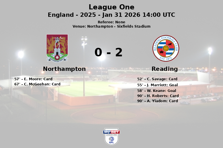 The match was tense, with several yellow cards shown. C. Savage, E. Moore, C. McGeehan, H. Roberts, and A. Yiadom were cautioned. Reading, with greater ball possession (58%), committed more fouls (12) than Northampton (5). In the end, Reading’s decisiveness in the second half sealed their victory in a hard-fought encounter.