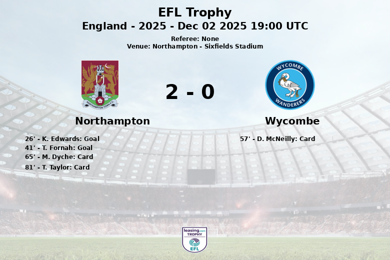 The first goal came in the 26th minute, scored by K. Edwards, assisted by E. Wheatley, giving Northampton the lead. Shortly before halftime, T. Fornah extended the lead in the 41st minute.