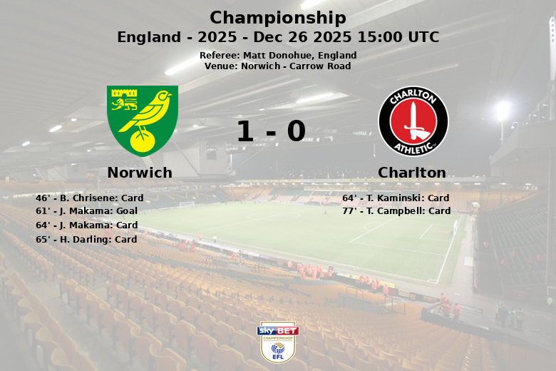 The only goal of the match came in the 61st minute, thanks to J. Makama, who capitalized on a play to give Norwich the decisive lead. The game was characterized by a high number of fouls, with 9 committed by Norwich and 16 by Charlton. Referee Matt Donohue cautioned three Norwich players and two Charlton players throughout the match. Despite Norwich’s 5 corners and Charlton’s 6, neither team could convert them into goals.
