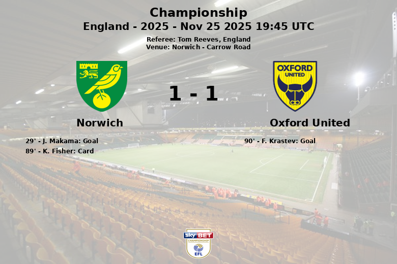 Norwich took the lead in the 29th minute with a goal from J. Makama. The game remained with ball domination by Norwich and with Oxford’s attempt to equalize the score. Deep into stoppage time, in the 90th minute, F. Krastev equalized for Oxford, securing a valuable point on their visit.