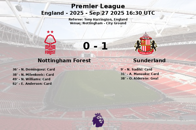 O. Alderete’s goal in the 38th minute, assisted by G. Xhaka, gave Sunderland the lead, which they managed to hold onto despite constant pressure from Nottingham Forest. The match was characterized by intense play, with a total of four yellow cards for Nottingham Forest (N. Dominguez, N. Milenkovic, N. Williams and E. Anderson) and two for Sunderland (N. Sadiki and A. Masuaku). Despite the 7 corners in favor of Nottingham Forest, Sunderland defended with organization and took all three points. Nottingham Forest committed 11 fouls, while Sunderland committed 6. Sunderland had 3 shots on target and 5 shots off target, compared to Nottingham’s 10 shots off target.