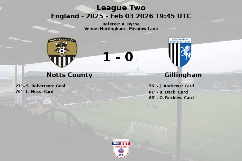 Nottingham, England – Notts County secured a vital victory against Gillingham in a League Two match played at Meadow Lane on February 3, 2026. The solitary goal of the encounter arrived in the 27th minute, courtesy of S. Robertson, who capitalized on an excellent assist from O. Norburn to put the home side ahead.