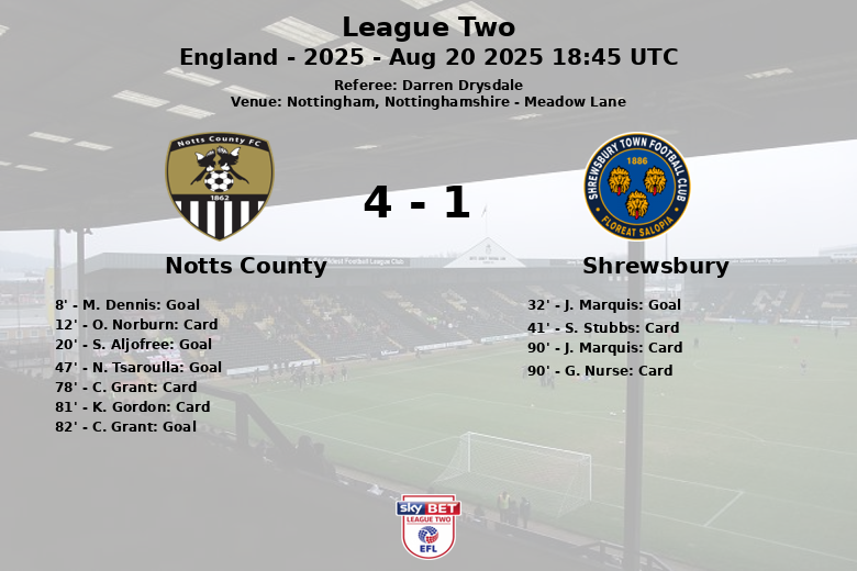 The goal-scoring spree began early, with M. Dennis opening the scoring for Notts County in the 8th minute. S. Aljofree extended the lead in the 20th minute, assisted again by M. Dennis. Shrewsbury attempted to respond, with J. Marquis pulling one back in the 32nd minute, set up by S. Stubbs, but Notts County’s response was emphatic.