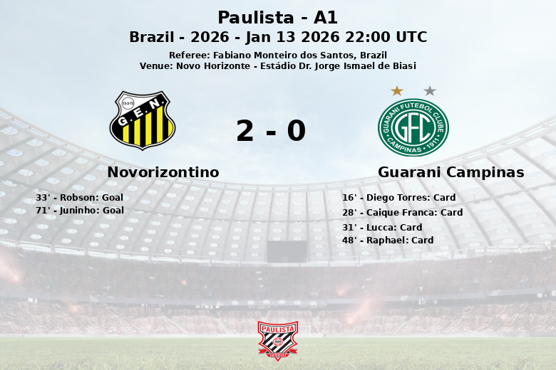The match became complicated for Guarani Campinas early on, with a series of yellow cards that culminated in Lucca’s expulsion in the 31st minute. From that moment on, Novorizontino intensified its pressure, and Robson opened the scoring in the 33rd minute, assisted by Romulo.