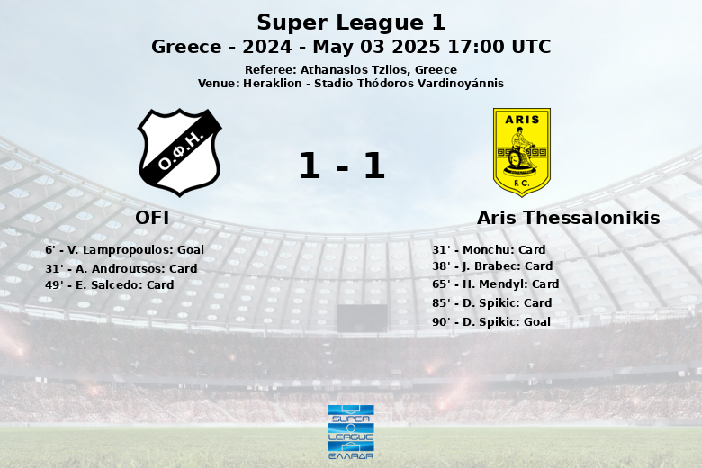 V. Lampropoulos scored for OFI in the 6th minute, assisted by B. Gonzalez, giving OFI the early lead. However, Aris managed to equalize the score in injury time with a goal from D. Spikic.