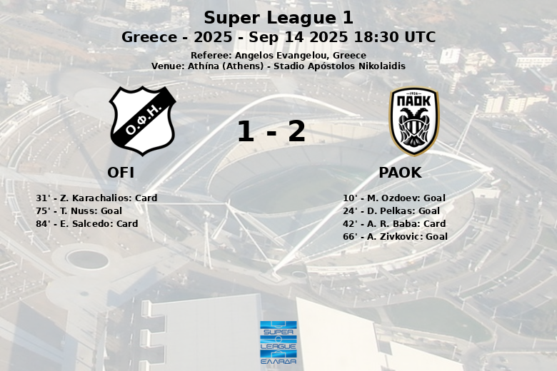 Athens, Greece – In a match held at the Stadio Apóstolos Nikolaidis, PAOK triumphed over OFI with a final score of 2 to 1, in a game corresponding to the third round of Super League 1. The visiting team demonstrated greater effectiveness in front of goal, capitalizing on their opportunities in the first half of the match.