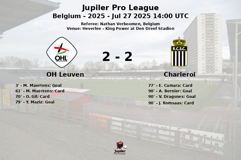 The match between OH Leuven and Charleroi at the King Power at Den Dreef Stadion in Heverlee ended in an exciting draw that left fans on the edge of their seats. From the start, the game promised strong emotions. In the 3rd minute, M. Maertens opened the scoring for OH Leuven with a goal assisted by T. Verlinden.
