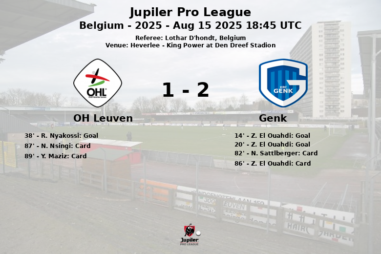 Genk dominated ball possession with 62% compared to OH Leuven’s 38%, which translated into a higher number of shots on target (7 compared to OH Leuven’s 6). While both teams generated a similar number of corners (6 for Genk and 5 for OH Leuven), Genk proved more effective in finishing. The match was also characterized by a high number of fouls, 16 committed by OH Leuven and 9 by Genk, which resulted in yellow cards for players from both teams. N. Sattlberger and Z. El Ouahdi were cautioned for Genk, while N. Nsingi and Y. Maziz received cards for OH Leuven. The match ended with a victory for Genk, who established themselves as an important contender in the Jupiler Pro League.
