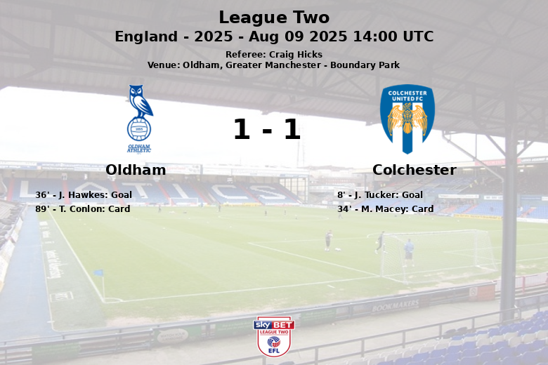 Oldham and Colchester United played to a draw in a closely contested match at Boundary Park, leaving fans with mixed feelings. Colchester took an early lead in the 8th minute thanks to a goal by J. Tucker, assisted by O. Thorn. However, Oldham responded in the first half with a goal by J. Hawkes in the 36th minute, after a pass from J. Robson, leveling the score before halftime.